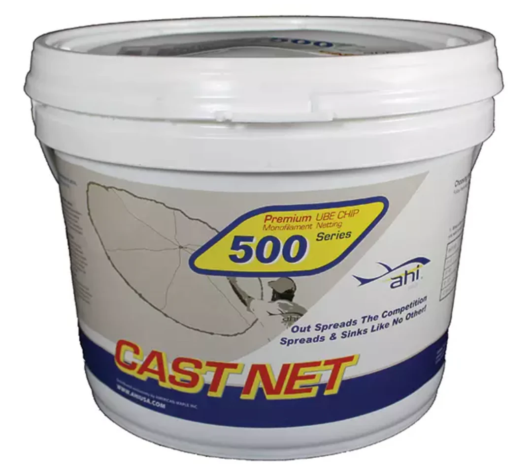 A popular mesh size for targeting mullet, bunker, and other larger sized bait. The 500 Series Cast Nets are designed with a 6 panel construction enhanced with Double Knotted Premium UBE Chip Monofilament Netting, 1” square mesh, 100 lbs test Braille Lines, and 1¼ lbs of actual lead weight per foot. A long 30 ft handline is secured with a commercial grade anodized swivel. Each net is packed in a durable plastic pail, which works great for holding bait.