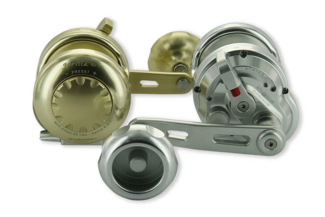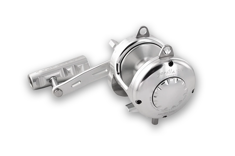 Alutecnos Albacore Gorilla series reels are small, powerful, elegant and immediately recognizable. These reels feature a multi-disc drag system that can be set at over 40 lbs on some models. Guaranteed free spool, and optimized gear ratios work perfectly with these reels to give them very high fish-fighting power. These reels were made for extreme deep-jigging purposes, but the smaller sizes can be used for inshore fishing as well.