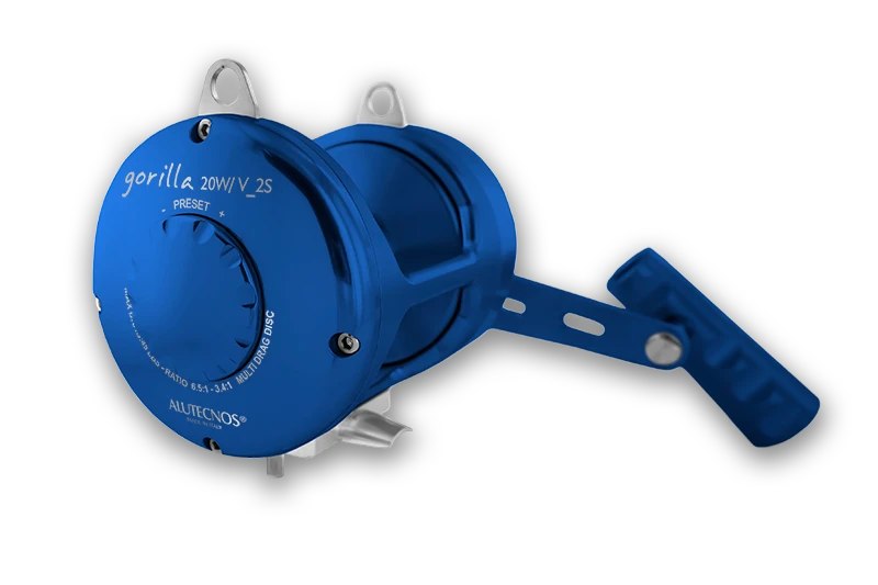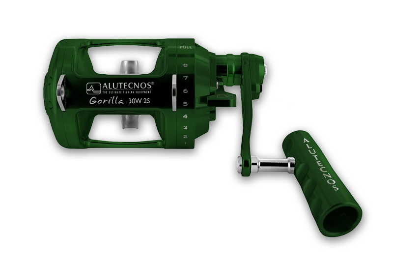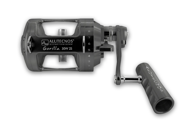 Alutecnos Albacore Gorilla series reels are small, powerful, elegant and immediately recognizable. These reels feature a multi-disc drag system that can be set at over 40 lbs on some models. Guaranteed free spool, and optimized gear ratios work perfectly with these reels to give them very high fish-fighting power. These reels were made for extreme deep-jigging purposes, but the smaller sizes can be used for inshore fishing as well.