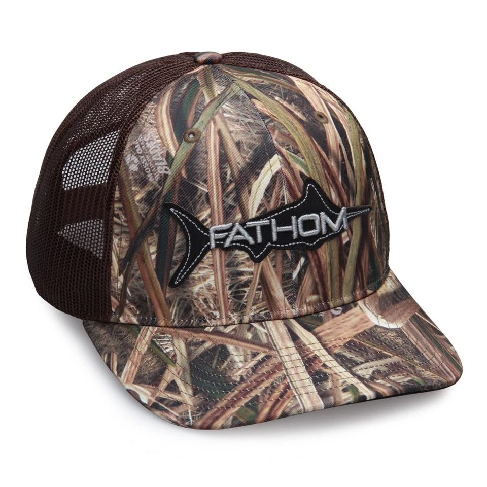 Mesh back trucker cap featuring Mossy Oak blades camo and our classic trawler marlin applique / 3D embroidered Fathom text. Snap Back Adjustable.