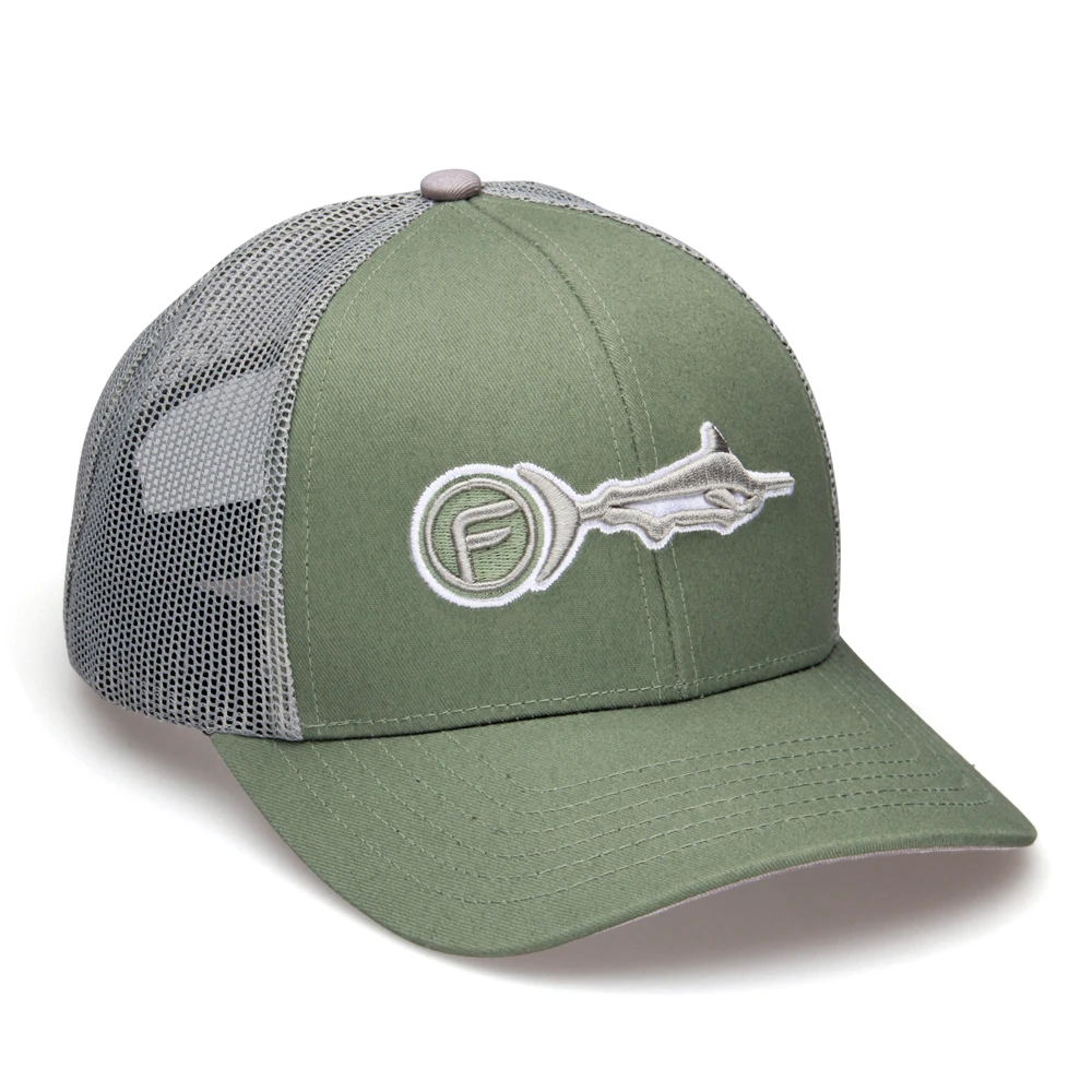 Mesh back trucker cap featuring a 3D Lure Eye “F” logo embroidery.
