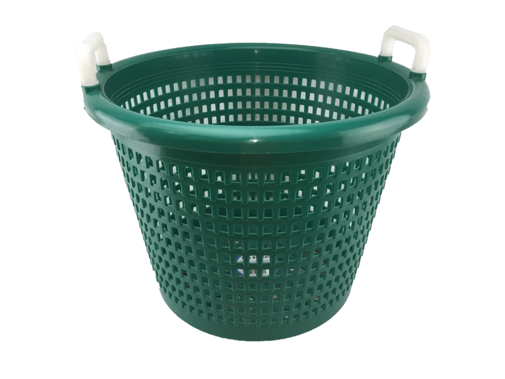 These fish baskets (aka. Shrimp baskets) are constructed from heavy duty plastic. They are meant for commercial fishing purposes, and they also make excellent baskets to keep harpoon line and a poly ball for big game fishing. These baskets are useful for storing and transporting fish, shrimp, scallops, clams, crabs, and just about anything else that you could think of!Â