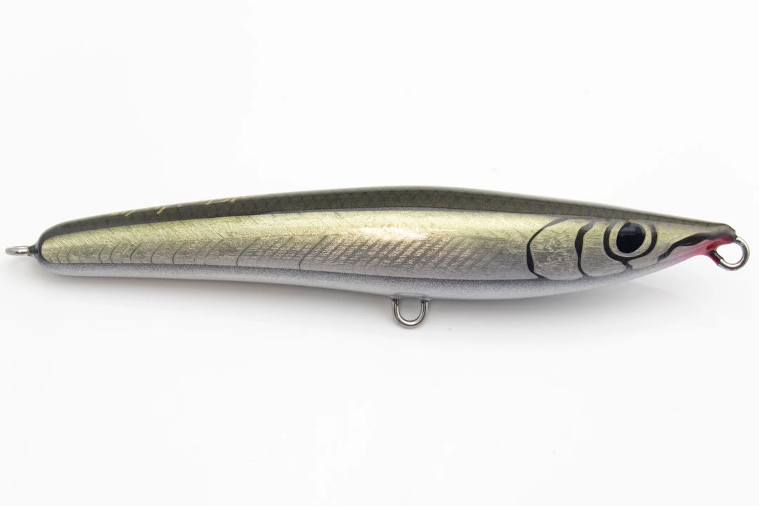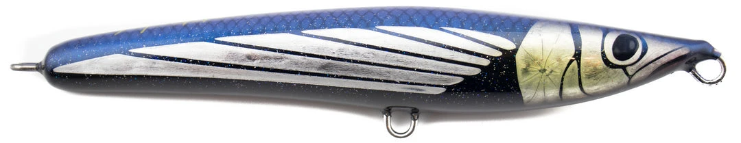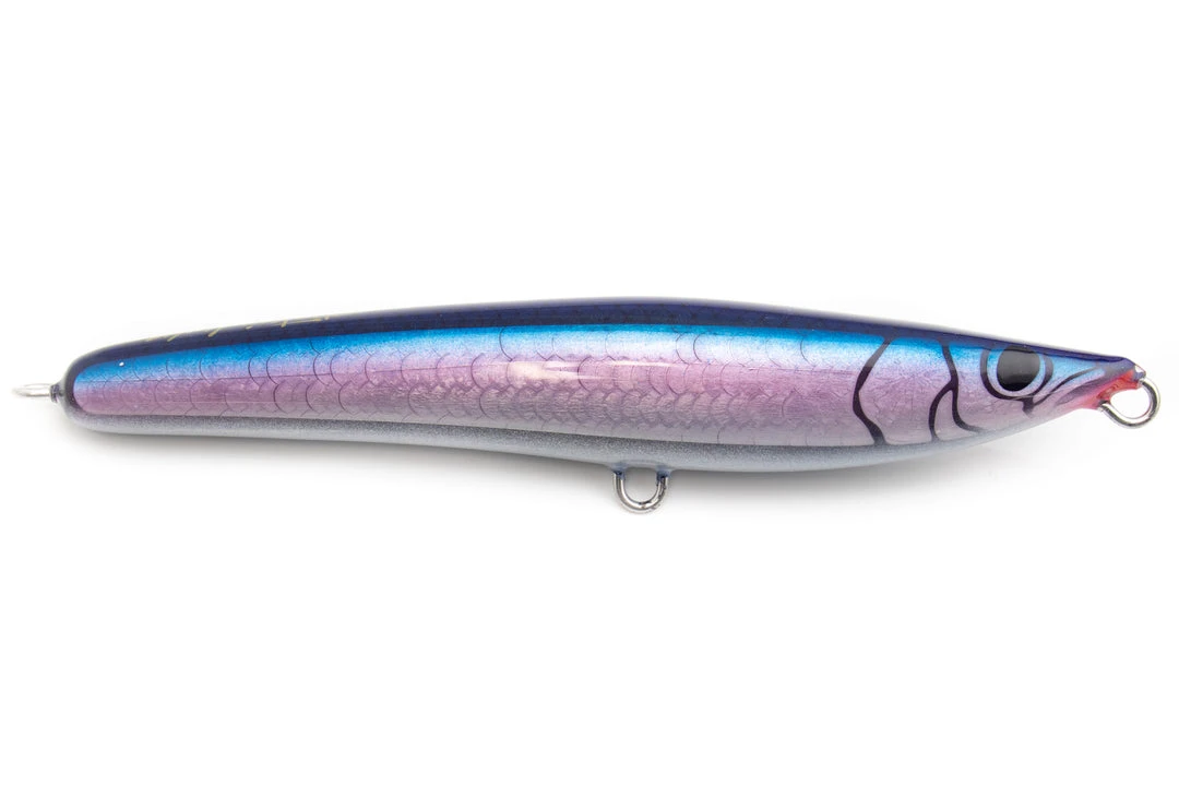 The Pacific Saury belongs to the family Scomberesocidae. They comprise of highly migratory pelagic schooling fish whose range include the North Pacific, Japan to the Gulf of Alaska, and south to Mexico. They are generally found offshore near the surface, gliding out of the water as predators attack, just like their flying fish cousins. A popular forage species for Tuna and Billfish, their iridescent sides, slim profile and side to side action make them an attractive and rewarding meal. The name Espada (or Yaiba) aptly describes the slicing action of this lure. The Espada series measures 9.25 inches and represents an adult Pacific saury, Ballyhoo, Flying fish, a juvenile Mackerel or Herring and makes it a good all around multi-species casting lure.