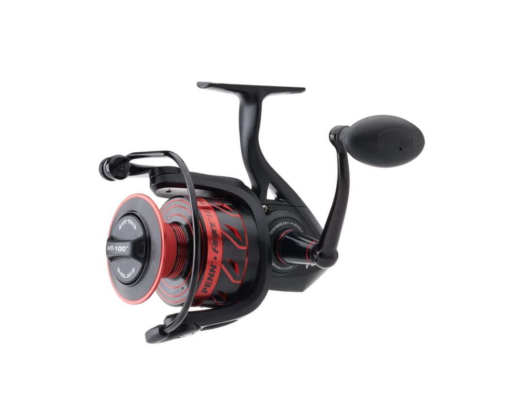 The PENN® Fierce® III spinning reels are available in a range of sizes, from 1000 to 8000. Featuring a full metal body and sideplate, along with PENN HT-100â„¢ carbon fiber drag washers, the Fierce III can handle anything inshore or nearshore. A 4+1 shielded stainless steel ball bearing system ensures smooth retrieves while the heavy-duty aluminum bail wire and superline spool allow for easy line management.Â