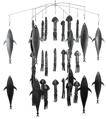 Squidnation has joined teams with Marlin Mudflaps to bring you the Blackflap Dredge. This dredge was inspired by the incredible success of both Squidnation Dredges and Marlin Mudflap Dredges in place like the Domican Republic, Costa Rica and the Bahamas. The action of the squids on the inside represent a ball of squids trying to defend themselves and the Mudflap tunas represent a pod of small tunas attacking the squid. This happens every single minute of every single day in our oceans. But now it can happen behind your boat. Nothing generates a strike from a top predator then smaller predators feeding. Create what works in nature and get more bites! Constructed of 7 chains of 9 inch Squidnation Squids and 6 13 inch Mudflap Marlin Tunas and a 36 inch stainless steel Strike Point Dredge Bar. Pick your favorite color squids and get ready for a strike!