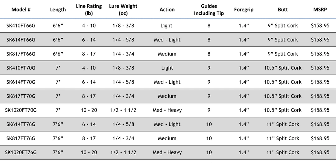 Seagis inshore rod series from Star Rods incorporates the latest component technology to create an ultra-lightweight inshore rod with superior sensitivity. Only top quality Fuji® components are used on the fast taper, high-modulus specially processed graphite blank. Fuji’s® SK2 split reel seat gives increased sensitivity while reducing weight. The Fuji® K-Series Tangle-Free guides with Alconite rings are lightweight and shed tangles that occur while using today’s popular braided lines. Top quality cork split grips further reduce weight. Weighing in at a mere 3.5 oz – 4.3 oz, Star Rods has set the new standard as the premier inshore fishing rod. There are a total of ten models available in lengths of 6’6”, 7’, and 7’6”.