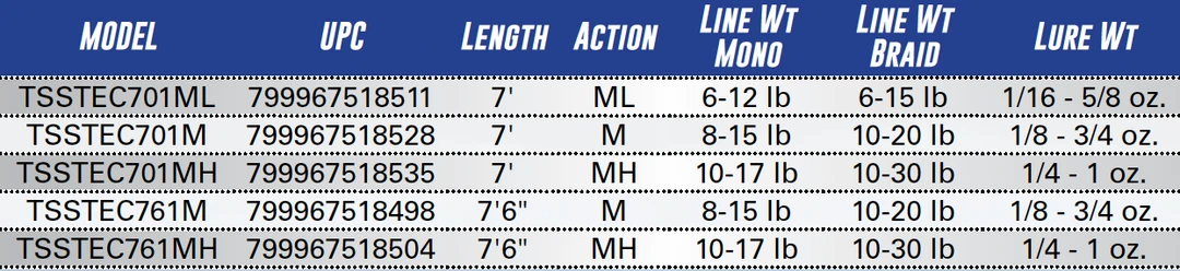 Tsunami Scale Tech rods feature IM-7 graphite fiber MD-7 technology construction.This consists of multidirectional carbon fibers combined with cross sectional carbon fiber scrim material to deliver reinforced flexural strength and increased hoop strength under all loading. The reinforced tip area armors against failure due to high sticking. Stainless steel frame SeaGuide guides feature braid proof ceramic rings. The proprietary Tsunami Scaletech pattern blanks boast genuine Fuji® reel seats and tough, attractive burl cork grips.
