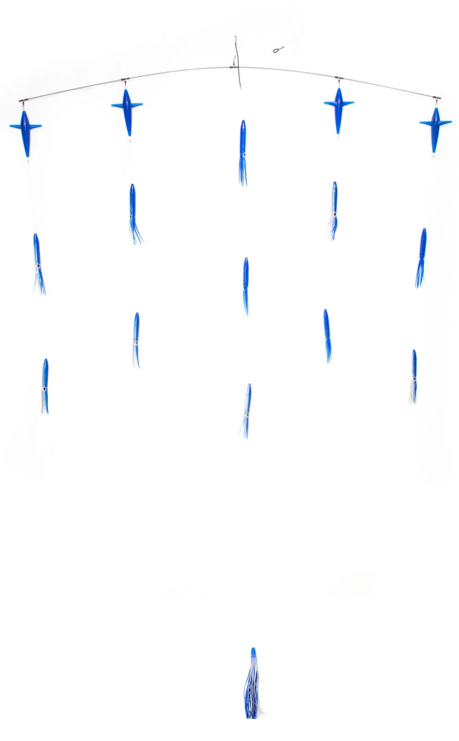 These spreader bars are rigged in a pattern that is meant to give the illusion of a group of squids/baitfish moving as a school with an “injured” bait dropped further back as the hook bait. The birds add splash, which yellowfins and bigeyes in particular seem to love. The birds also help the bar ride well in rougher conditions. This particular bar works well in any position in the spread, but our favorite spot for it is tight to the boat on the flat line, or on the long rigger.