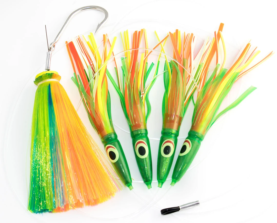 For when running just a Shute isn’t enough. Similar to our Clone Blaster daisy chain, except this one has a color coordinated 5-3/4oz. Joe Shute as a hook bait to rig a ballyhoo on. This is an deadly combination for bigeye tuna, bluefins, yellowfin, and mahi-mahi. We rig these on 200 lb. monofilament, with a heavy duty Mustad hook, precision crimped with a bench crimper “pin rig” style for rigging a ballyhoo.