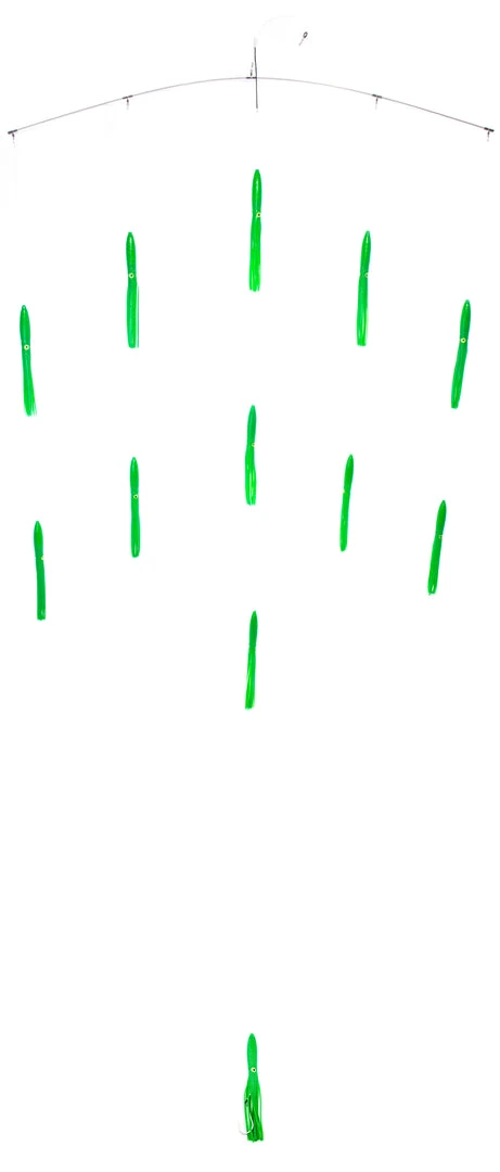 These spreader bars are rigged in a pattern that is meant to give the illusion of a group of squids/baitfish moving as a school with an “injured” bait dropped further back as the hook bait. This bar, featuring 11 inch shell squids is great for attracting larger tunas specifically. When you’re seeking out bigeyes, and large bluefins & yellowfins, this is the right bar to put out. This particular bar works well in any position in the spread, but our favorite spot for it is on the short rigger.